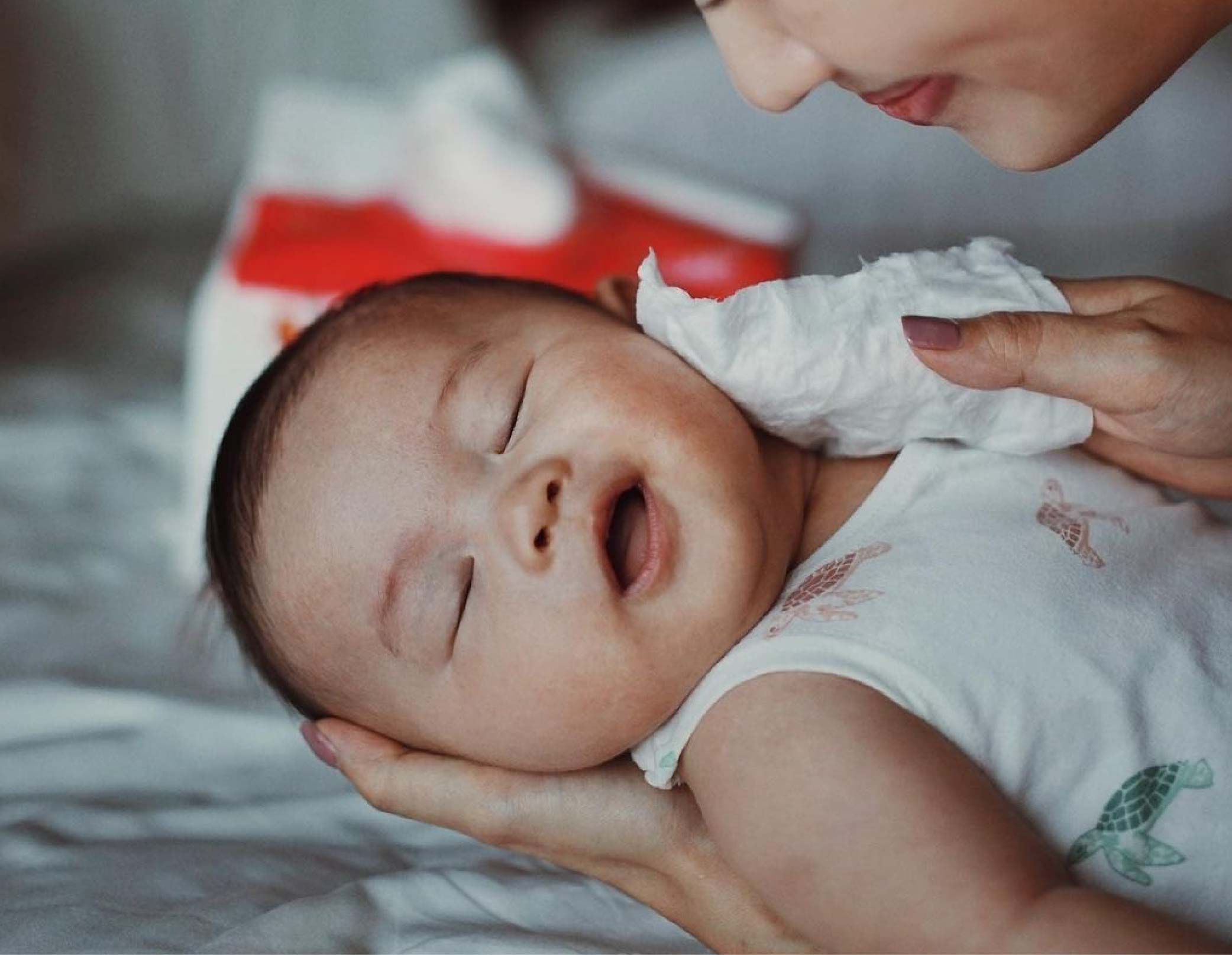 Dampen a piece of Suzuran Baby Antibacterial Cut Cotton with lukewarm water and gently wipe around the eyes, nose, mouth, cheeks and chin. Clean from the inner corner of the eye outward. At this stage, water is enough. No soap is needed for newborn skin.