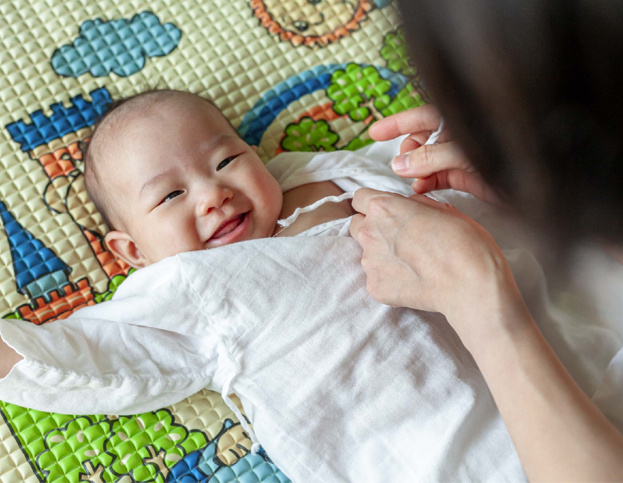 Undress your baby and swaddle your baby in a Suzuran Baby Gauze Swaddle Bath Towel. This keeps them warm and prevents sudden chills. Slowly immerse your baby into the bath tub and let your baby gets used to the water sensation, then unswaddle your baby limb by limb. Wash your baby’s body using a Suzuran Baby Soft Handkerchief. Start with the neck area, then clean the arms, chest, tummy, back and legs. Pay attention to skin folds around the neck, thighs and underarms where milk and sweat can collect.