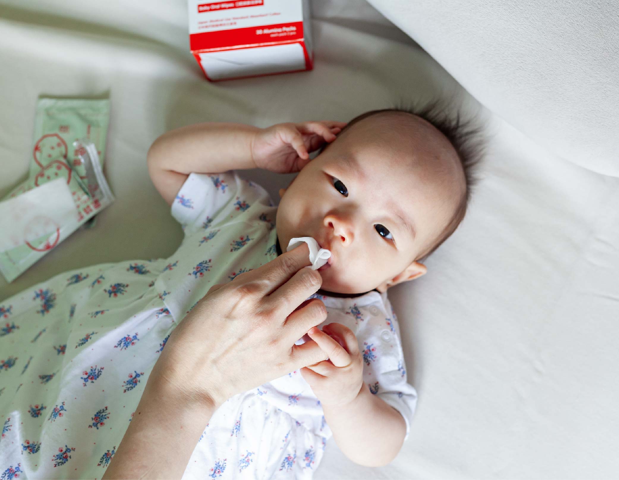 Finish with gentle cleaning care. Use one piece of Suzuran Baby Wet Cleaning Cotton to clean your baby’s tongue, another piece to clean upper and lower gums. For small spots like baby’s ears and nostrils, use Suzuran Baby Antibacterial Cotton Swab.