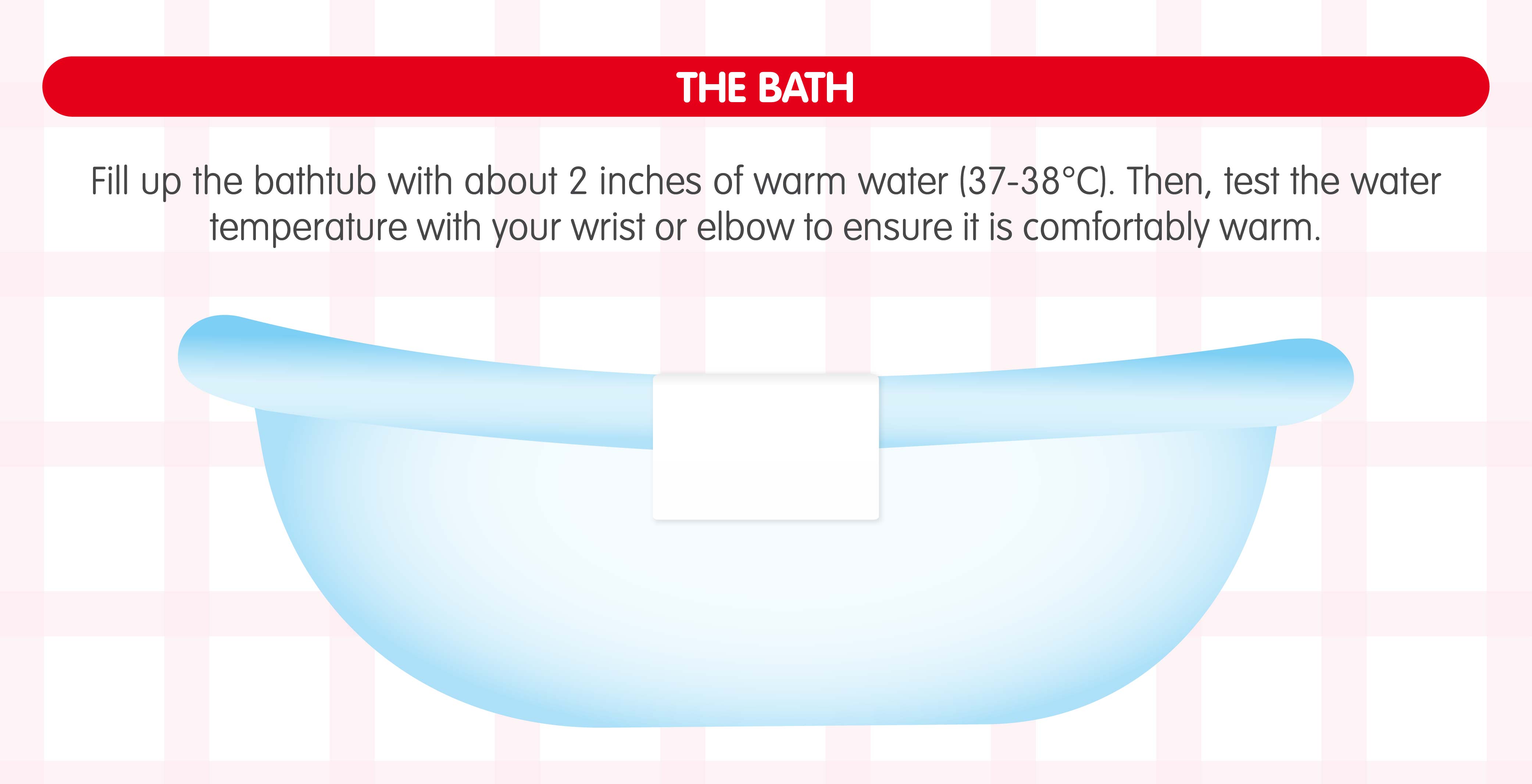 Gather the supplies. Warm the room. Prepare the bath. Before you start, get everything ready so you never have to walk away from your baby mid-bath. Place towels, clean clothes and baby cotton within reach. Fill the baby tub with about 2 inches of warm water at around 37 to 38°C. Test it using your wrist or elbow to make sure it feels comfortably warm. Here is a list of what you need to prepare for baby’s bath: