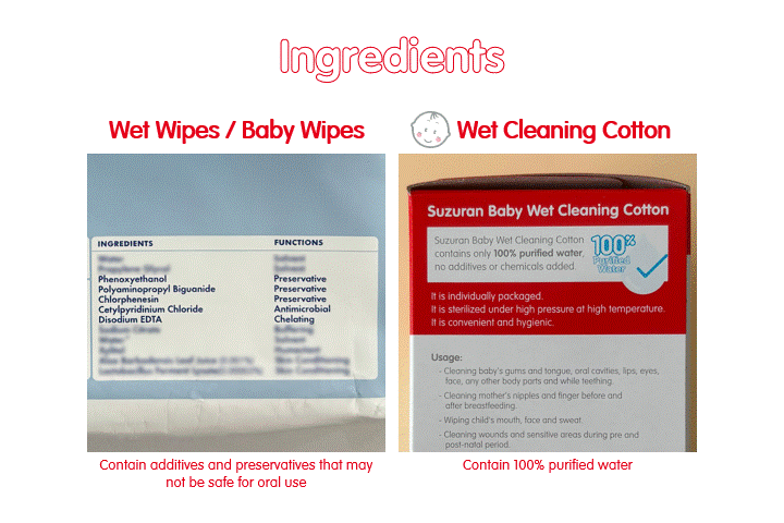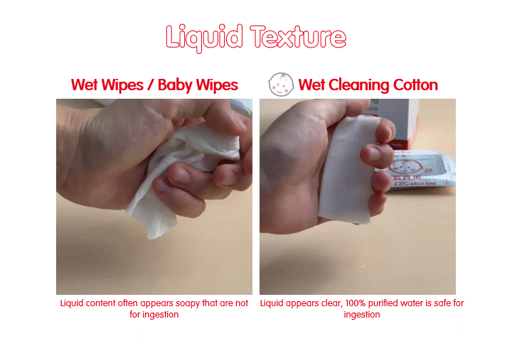 Suzuran Baby Wet Cleaning Cotton, on the other hand, is added with 100% purified water, in which it appears clear. There are absolutely no other ingredients added. 100% purified water contains zero minerals, which is even safer than adults’ drinking water. Parents can safely clean your baby’s mouth without any worries.